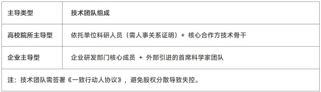 股权结构:技术团队需控股(高校院所主导型≥50%,企业主导型≥35%)(说明:其核心是确保研发机构的技术主导权,避免成为纯投资驱动型平台),且各投资方以货币出资为主,无形资产需确权评估(说明:技术专利作价入股需满足:评估报告由具备资质的第三方出具+作价比例≤总股本30%(超出部分需货币补足)。