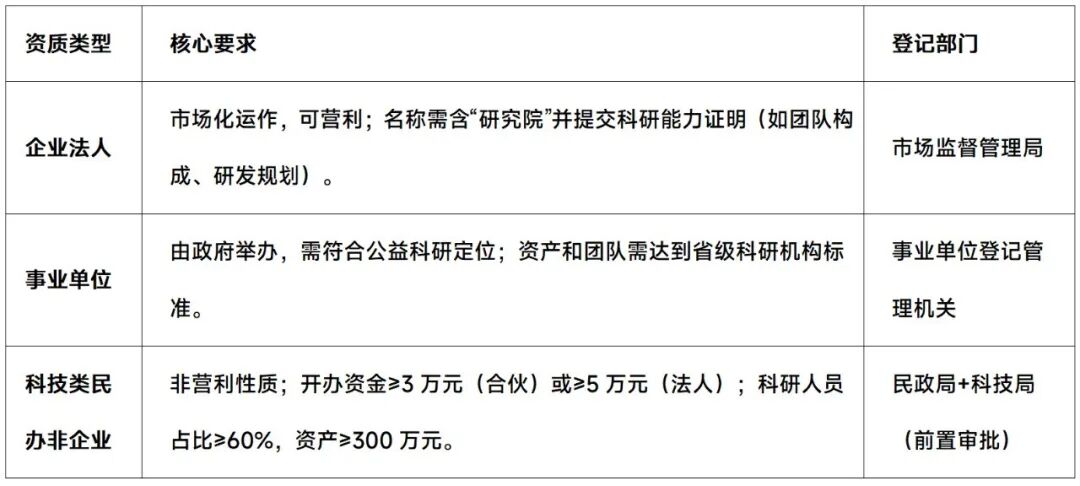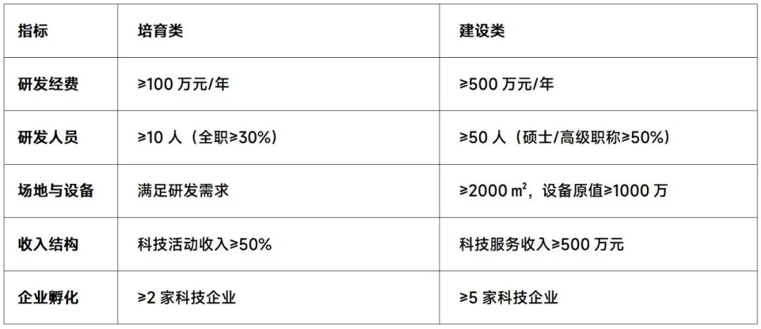 建设类:研发经费≥500万元,研发人员≥50人(硕士/高级职称≥50%),科研用房≥2000㎡,设备原值≥1000万元。