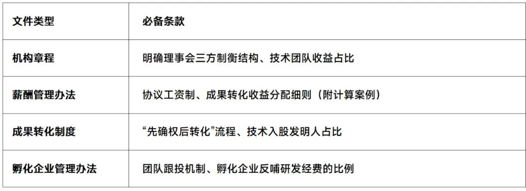 灵活的人事/薪酬制度:如“科学家+职业经理人”双轨制管理(操作要点:1.科研人员可保留原单位身份,但在新型机构领取市场化薪酬(需原单位书面同意)。2.科研人员可保留原单位身份,但在新型机构领取市场化薪酬(需原单位书面同意)。3.职业经理人聘任具备产业化经验的高管(如曾任科技企业CEO/COO),负责市场运营与融资)。